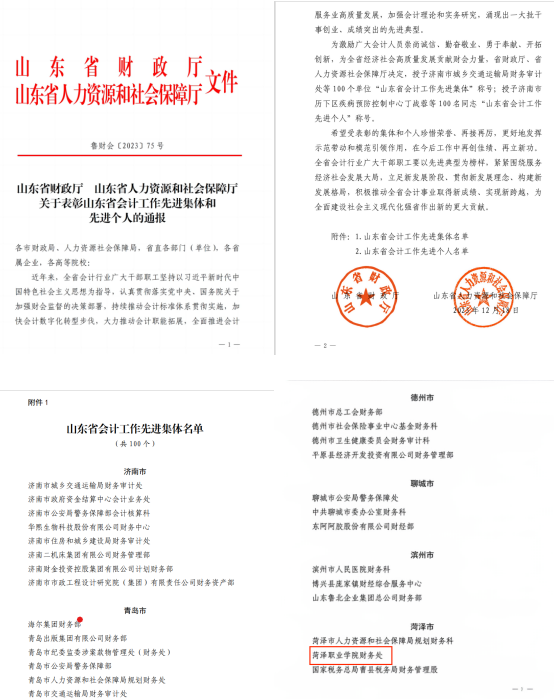 近日,山东省财政厅、山东省人力资源和社会保障厅联合印发《关于表彰山东省会计工作先进集体和先进个人的通报》(鲁财会〔2023〕75号),永利官网财务处荣获“山东省会计工作先进集体”称号,是山东省高职院校唯一获此荣誉的单位。