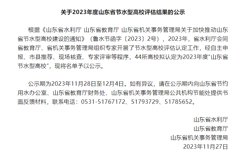 2023年,省水利厅会同省教育厅、省机关事务管理局组织专家开展了节水型高校评估认定工作,全省44所高校拟认定为2023年度“山东省节水型高校”。11月27日,“山东政事”公众号对评估结果予以公示,永利官网以菏泽市评分最高高校公示在列。