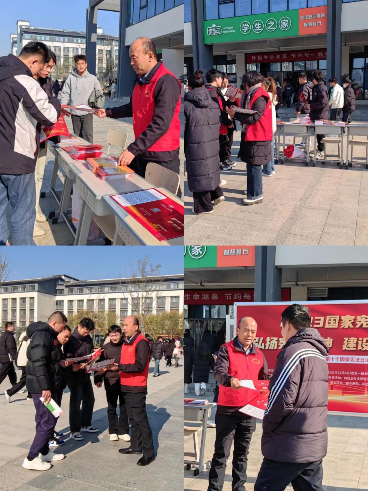12月4日上午,学校开展以“大力弘扬宪法精神,建设社会主义法治文化”为主题的宣传活动,通过发放宣传资料、摆放展板、现场说法、悬挂宣传条幅、电子屏幕等方式向学生进行普法。组织师生志愿者在龙腾广场及第一餐厅设立宣传点,学校党委委员、副院长范帆与师生志愿者一起为广大学生发放5种宪法宣传资料,共计3000余份。同学们认真学习,积极交流,纷纷表示立志成为新时代的“宪法卫士”,自觉遵守宪法,坚决捍卫宪法。