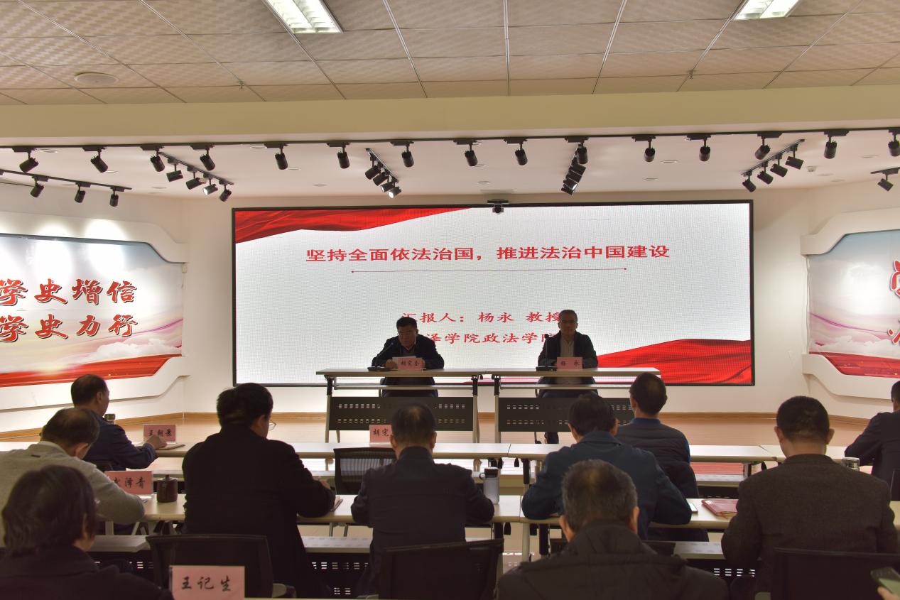 近日,永利yl23411官网举办法治专题报告会,邀请菏泽学院政法学院副院长杨永教授,以“坚持全面依法治国 推进法治中国建设”为题作专题讲座。学校党委副书记胡宪奎主持会议,王朝景、刘存长、程凤鸣、张继敏等校领导出席,与各处室、系部主要负责人、教师代表、学生代表共同聆听了一堂精彩而生动的法治课。