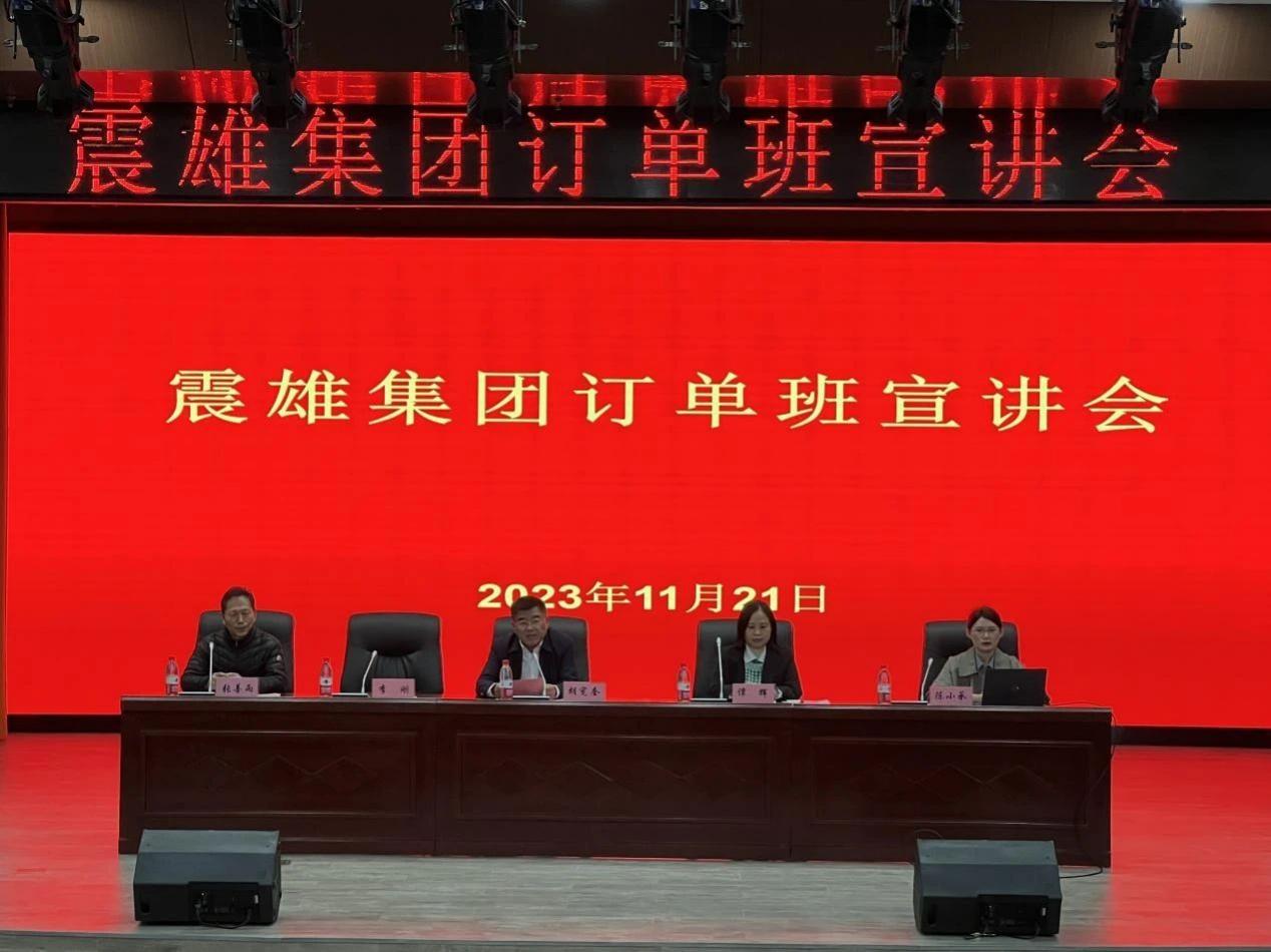 胡宪奎代表永利yl23411官网致辞,对谭辉一行的到来表示热烈欢迎。他说,为深化与震雄集团的合作交流,学校将会集中人力、财力、物力等优势资源,全力打造集实训教学、技术转化、仿真生产、技能培训、订单培养于一体的产教融合新模式,培养更多应用型高素质技能人才。学校组建震雄集团订单班,充分发挥学校和企业的各自优势,共同培养社会与市场需要的技术技能人才,震雄集团订单班对在座的广大同学来说也是一次重要机遇。
