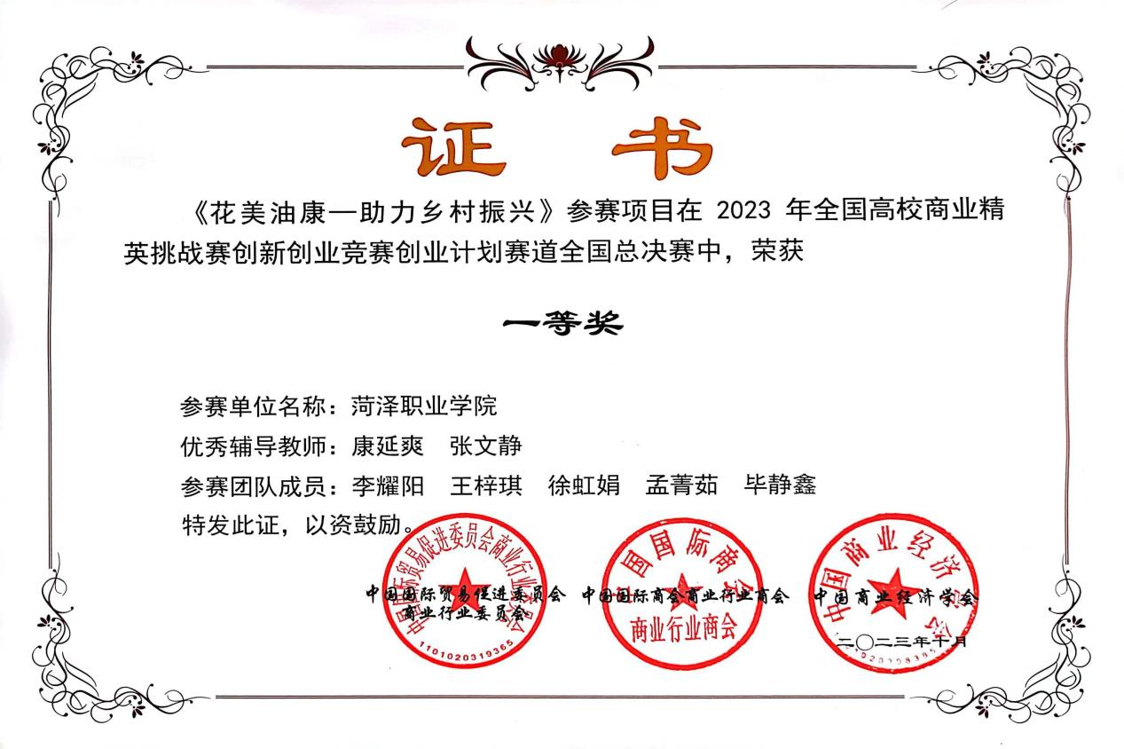 2023年10月,由王松教授指导,张文静和康延爽老师带队经济管理系李耀阳、王梓琪、徐虹娟、孟菁茹、毕静鑫五位学生,凭借作品“花美、油美——助力乡村振兴”继8月份山东省总决赛荣获一等奖后,近日在全国总决赛中获得一等奖。