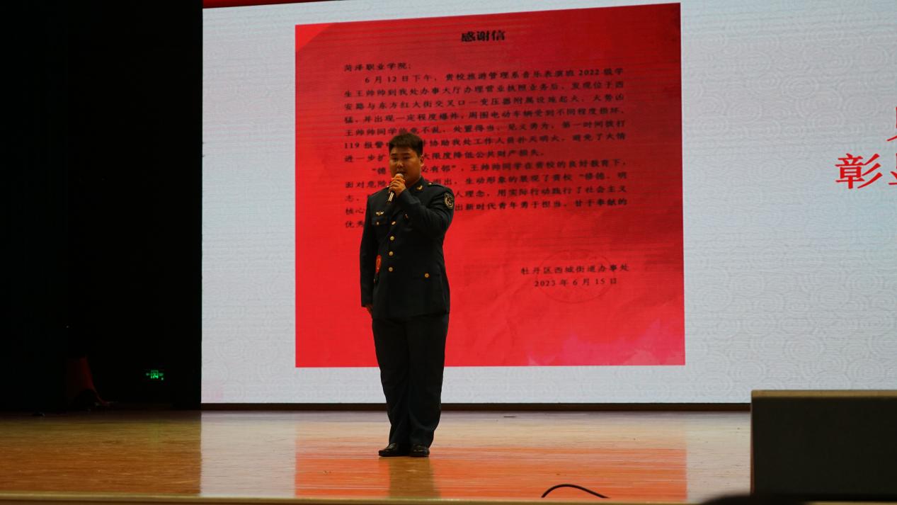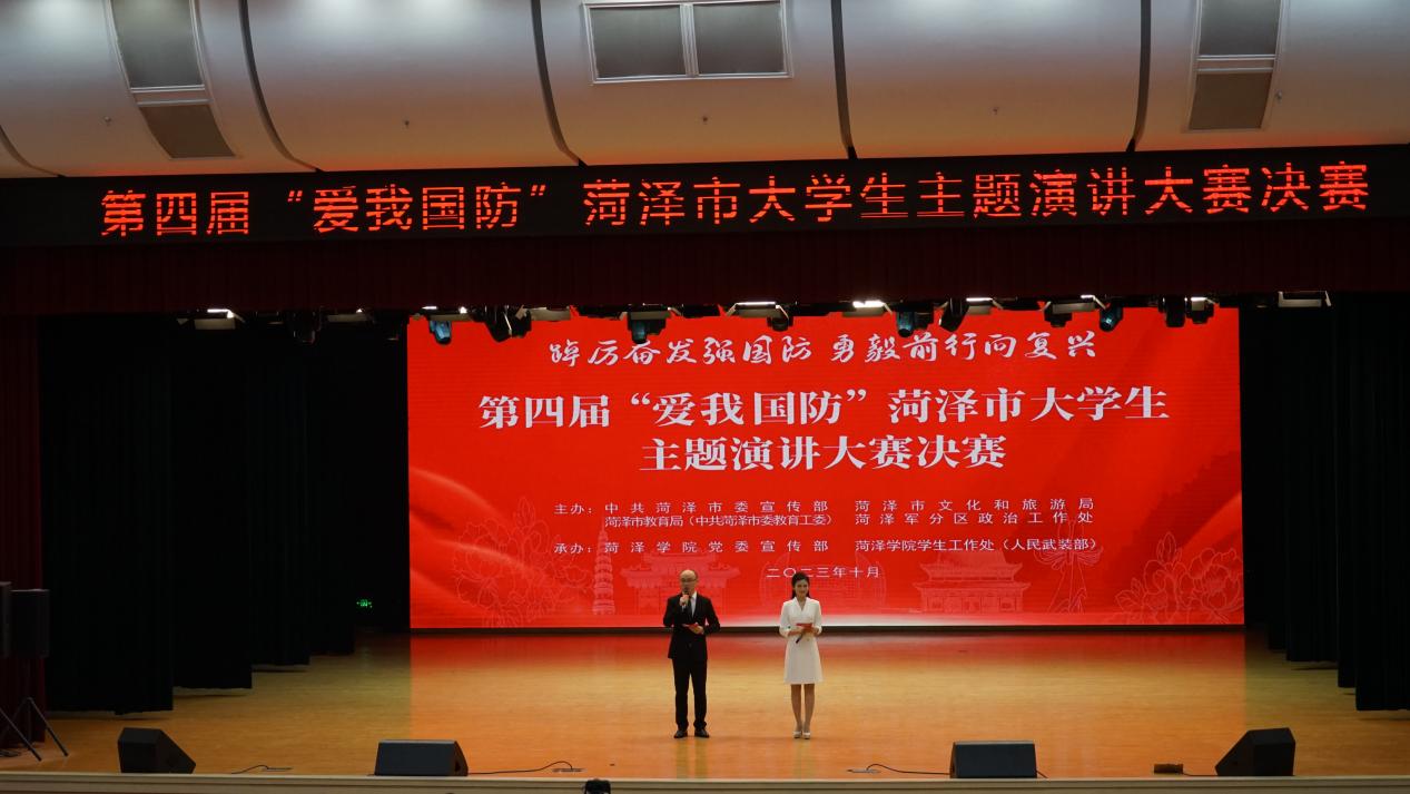 10月27日下午,由市委宣传部、市教育局(市委教育工委)、市文化和旅游局、菏泽军分区政治工作处主办,菏泽学院党委宣传部、学生处(人民武装部)承办,以“踔厉奋发强国防 勇毅前行向复兴”为主题的第四届“爱我国防”菏泽市大学生主题演讲大赛决赛在菏泽学院艺术中心演播厅举行。菏泽学院党委书记黄富峰,菏泽市委常委、宣传部部长、市委教育工委书记周生宏,菏泽军分区大校政委郑逢民出席活动并颁奖。