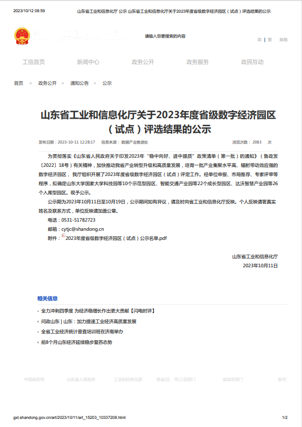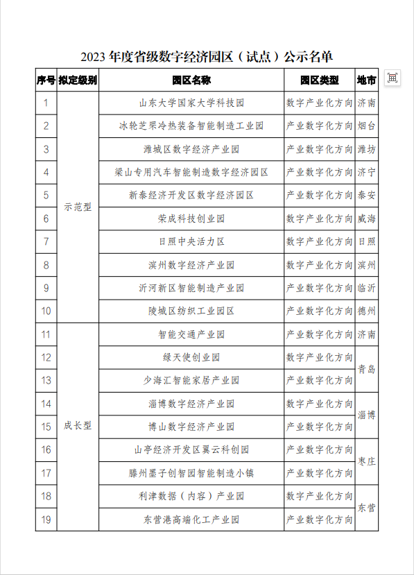 近日,山东省工业和信息化厅在山东省人民政府网站公示了2023年度省级数字经济园区(试点)的评选结果名单,经过申报、推荐和专家评审等程序,永利官网大学科技园成功入选山东省级数字经济园区。