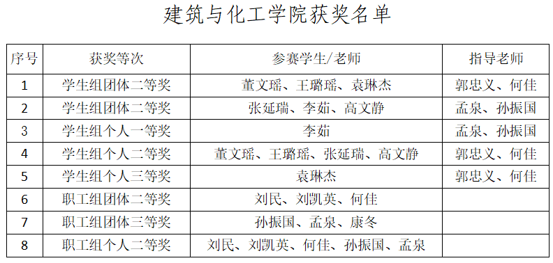 建筑与化工学院一直强调要基于“以赛促教、以赛促学”的理念继续深入“以赛促改”,结合系部学生及专业特点,努力提升学生的职业技能。此次成绩的取得,充分体现了师生良好的职业素养和精湛的技能水平。我院将基于各类技能大赛不断优化人培方案和教学模式,提高办学质量,为社会培养更多高素质技术技能人才。