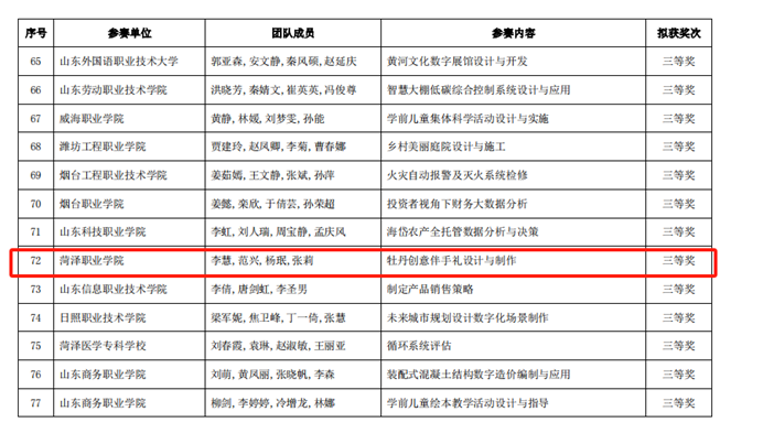 近日,山东省教育厅公示2023年山东省职业院校教学能力大赛获奖名单,信息工程系教师李慧、范兴、杨珉、张莉团队参赛作品《牡丹创意伴手礼设计与制作》项目获得高职组专业一组三等奖。