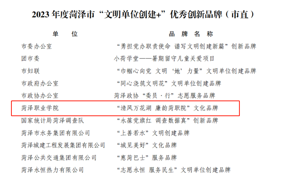 近日,菏泽市文明办发文公布了《关于公布2023年度菏泽市“文明单位创建+”优秀创新品牌的通知》,永利yl23411官网提报的“清风万花湖 廉韵菏职院”文化品牌获得2023年度菏泽市“文明单位创建+”优秀创新品牌。