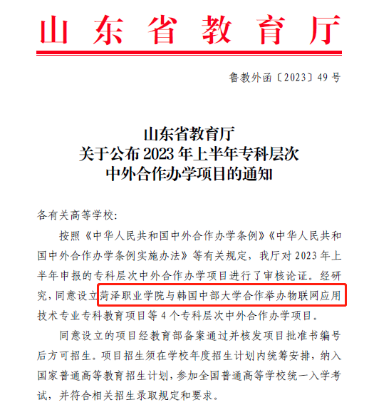 近日,山东省教育厅印发《关于公布2023年上半年专科层次中外合作办学项目的通知》(鲁教外函〔2023〕49号),永利官网与韩国中部大学合作举办的物联网应用技术专业专科教育项目成功获批,这是永利官网获批的第二个中外合作办学项目,标志着中外合作办学项目的发展再上新台阶。