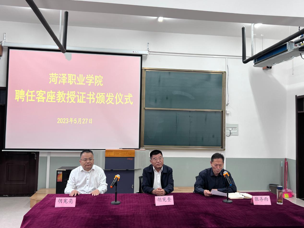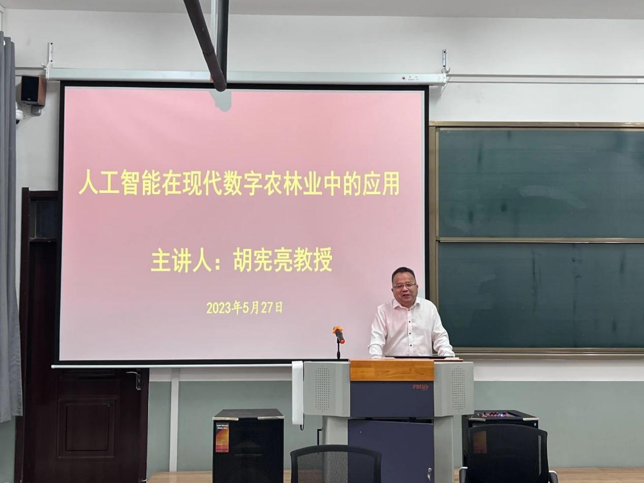 胡宪奎为胡宪亮颁发客座教授聘书。聘书颁发仪式结束后,胡宪亮为师生作了《人工智能在现代数字农林业中的应用》专题讲座。他以自身艰苦的创业经历为切入点,着重介绍人工智能在农林业领域的技术创新、应用场景及未来发展趋势。