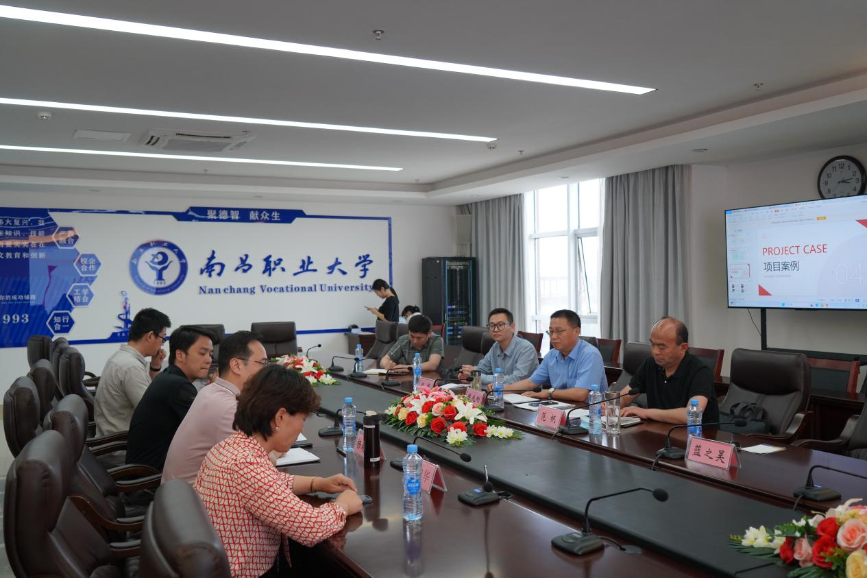 南昌职业大学党委委员、副校长杨晓培对考察团的到来表示欢迎。双方就产业学院建设项目落地、专业群建设、教学模式改革、教学成果打造、学生实习实训等方面进行深入交流与探讨。