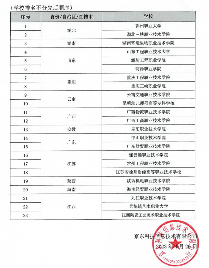 自2022年12月21日全国职业高等院校校长联席会议推荐有需求的高职院校申报“京东数字商务产业学院/京东数字技术产业学院”产教融合项目以来,京东科技集团和专家集中对全国 200 多所高职院校的申报书进行评审,遴选出 2023年第一批“京东数字商务产业学院/京东数字技术产业学院”,立项建设院校23 所,我院是山东省3所入围高校之一。