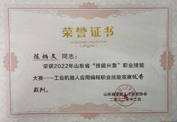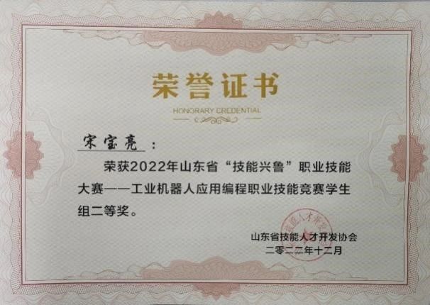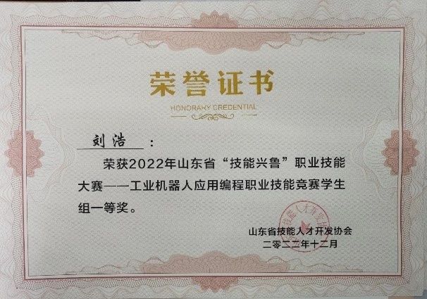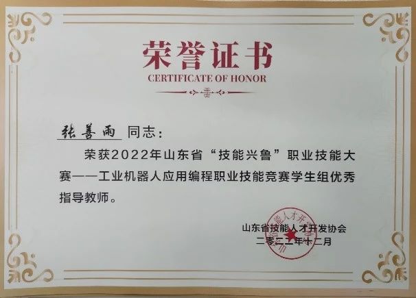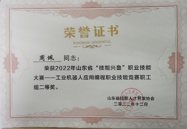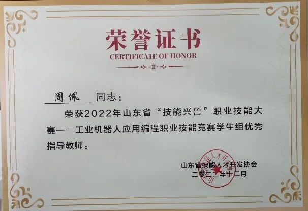 2022年12月,山东省“技能兴鲁”职业技能大赛工业机器人赛项在山东临沂成功举办,机电工程系选派的师生参加职工组、学生组比赛。由张善雨指导的刘浩同学获学生组第一名,周佩指导的宋宝亮获学生组二等奖,张善雨、周佩获优秀指导老师奖。同时,周佩老师参加职工组比赛,获得二等奖,近期荣誉证书正式下发。