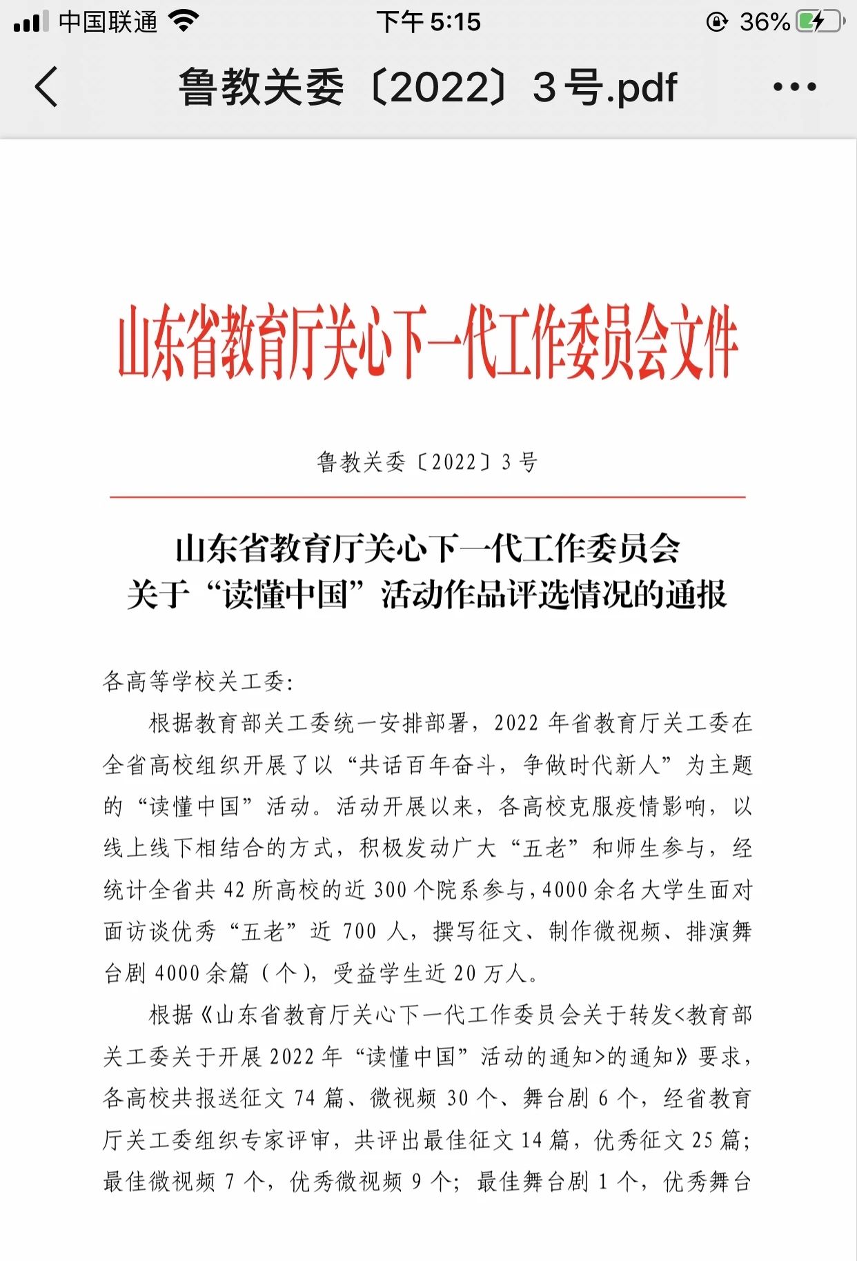 根据教育部关工委统一安排部署,2022 年山东省教育厅关工委在全省高校组织开展了以“共话百年奋斗,争做时代新人”为主题的“读懂中国”活动。活动开展以来,各高校以线上线下相结合的方式,积极发动广大“五老”和师生参与,经统计全省共 42 所高校的近 300 个院系参与,4000余名大学生面对面访谈优秀“五老”近 700 人,撰写征文、制作微视频、排演舞台剧 4000 余篇(个),受益学生近20万人。