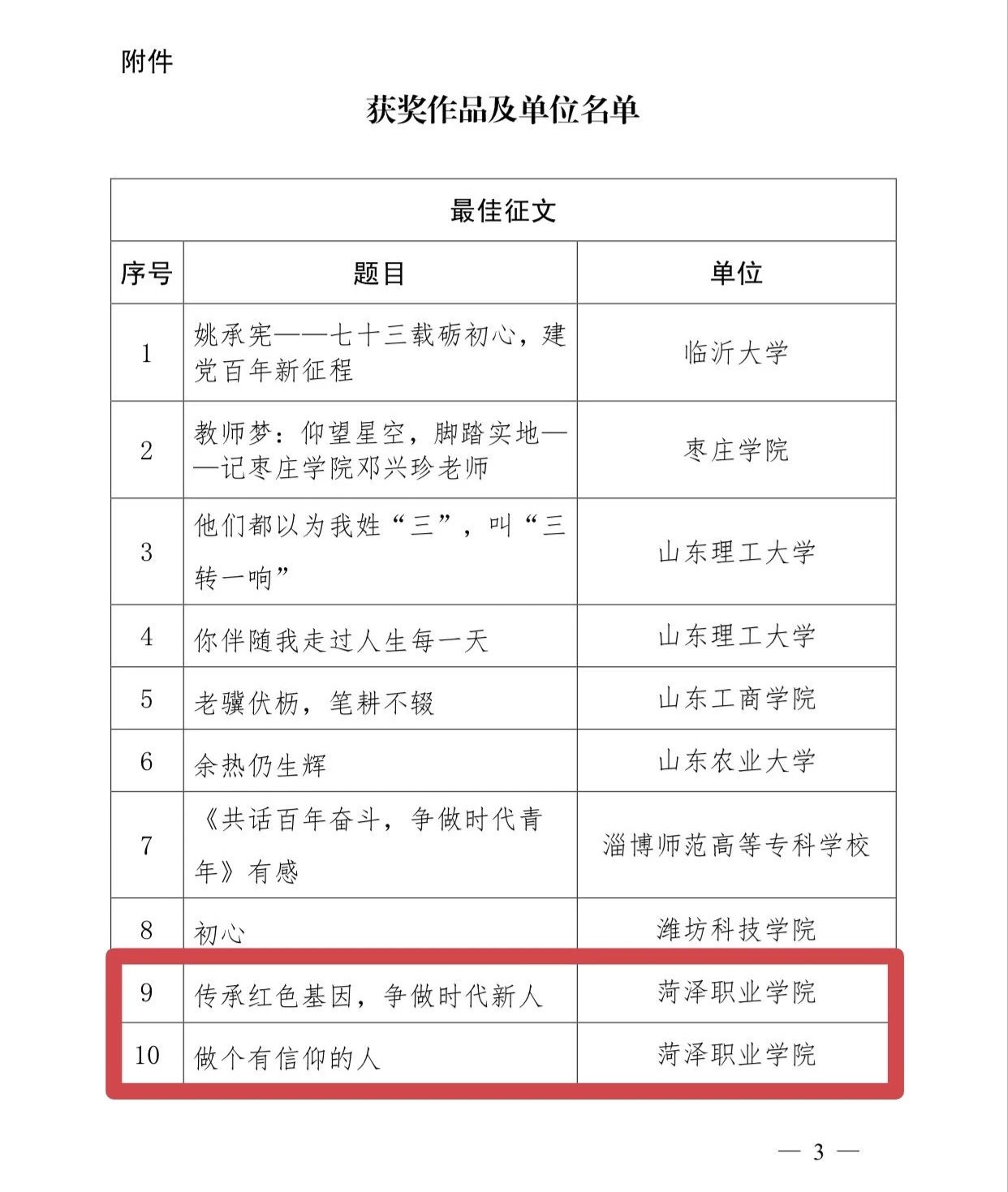 近日,山东省教育厅关工委发布《关于“读懂中国”活动作品评选情况的通报》,经省教育厅关工委组织专家评审,共评出最佳征文 14 篇,优秀征文 25 篇。我院报送的两篇征文作品《传承红色基因,争做时代新人》、《做个有信仰的人》荣获最佳征文奖。