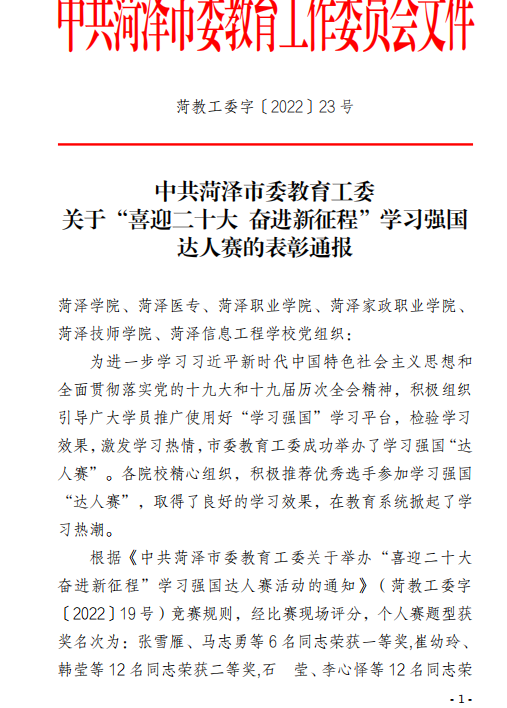 传承红色基因,汲取奋进力量,激发爱党爱国热情。日前,市委教育工委成功举办了“喜迎二十大 奋进新征程”学习强国达人赛,永利yl23411官网代表队在全市教育系统中荣获第三名,我院同时获评为活动优秀组织奖。