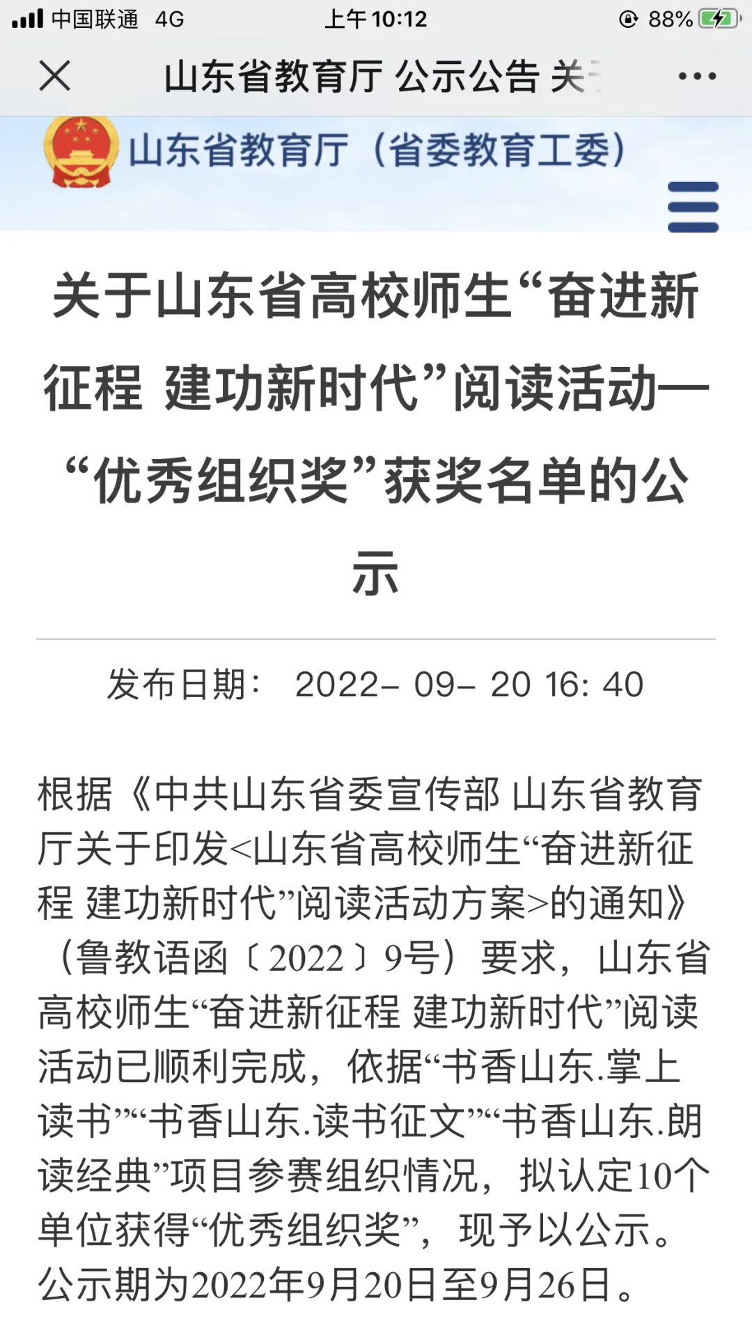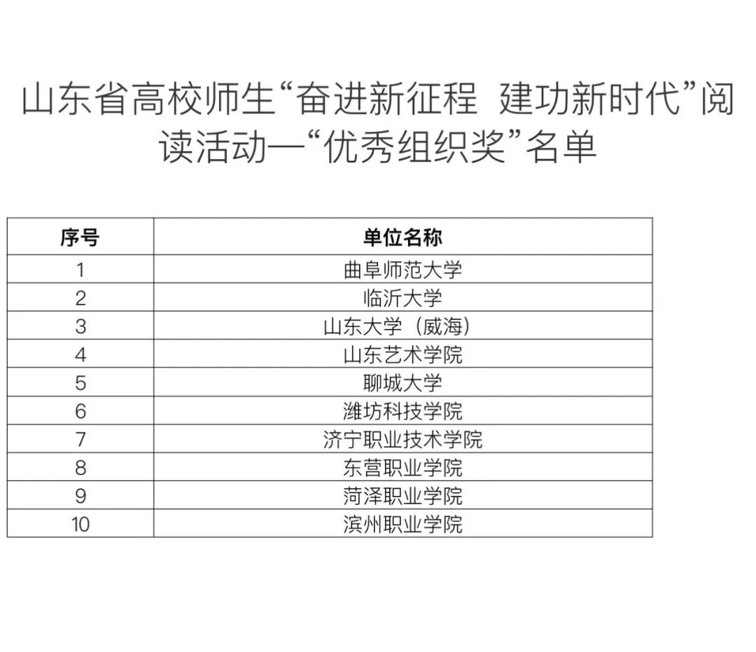 近日,山东省教育厅官网公示了山东省高校师生“奋进新征程 建功新时代”阅读活动优秀组织奖获奖名单,共有10所高校荣获“优秀组织奖”,我院榜上有名。