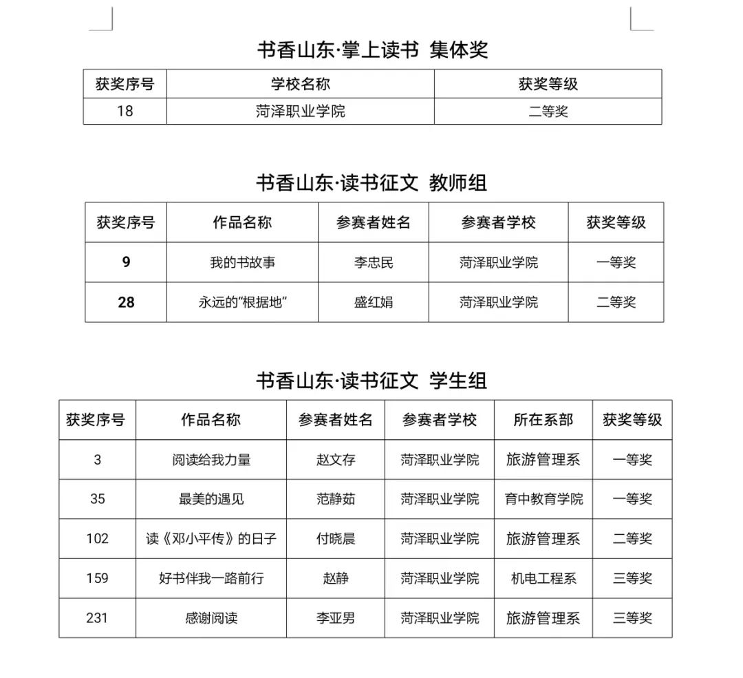 从今年五月份起,由山东省委宣传部指导,省教育厅主办,省语言文字工作委员会办公室、山东教育电视台承办的山东省高校师生“奋进新征程 建功新时代”阅读活动在全省高校中开展,活动分设“书香山东·掌上读书”“书香山东·读书征文”“书香山东·经典朗读”三个子项目,我院宣传部认真组织,全校师生积极参与,目前,“书香山东·掌上读书”“书香山东·读书征文”项目评审工作已顺利完成,我院获得集体奖二等奖;个人奖一等奖10个,二等奖14个,三等奖45个;学生组征文获一等奖的指导教师为“优秀指导教师”。