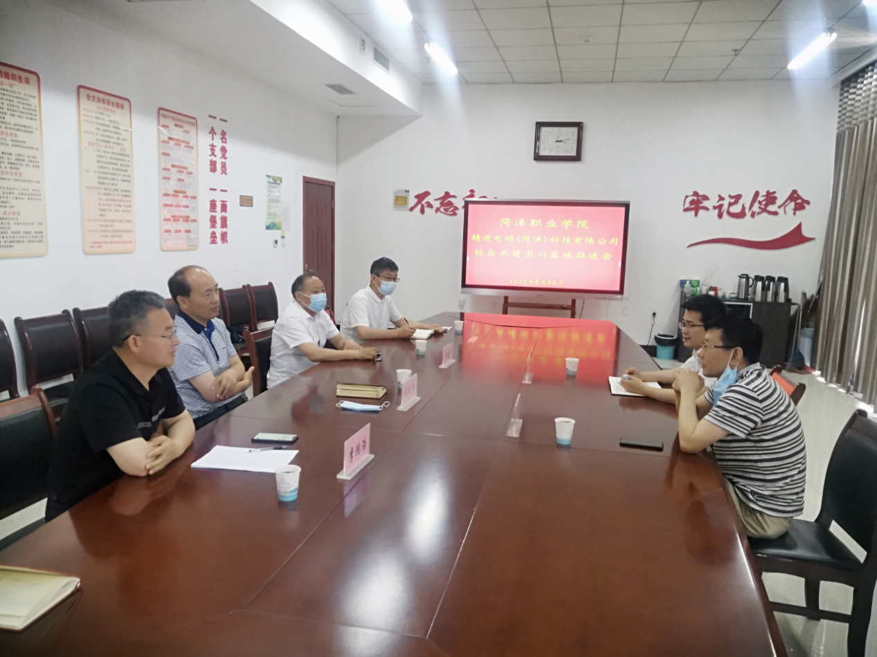 5月26日下午,为进一步拓宽人才培养渠道,提高人才培养质量,加深我院与优秀合作企业之间的关系,实现校企双方的共赢,精进电动科技(菏泽)有限公司厂长于业鹏,人事经理王汉锋一行到访我院,与我院领导在大学生创新创业园907会议室就校企合作实训基地建设推进工作展开座谈。