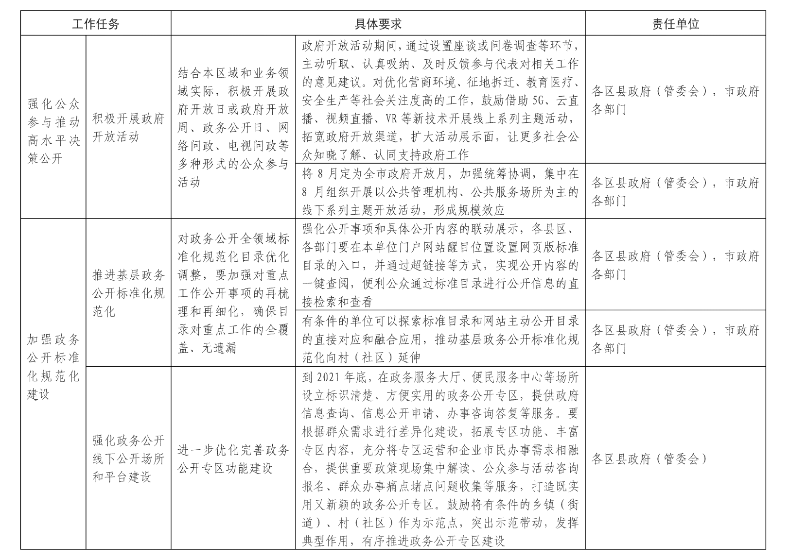 (三)积极开展政府开放活动。各县区、各部门要结合本区域和业务领域实际,积极开展政府开放日或政府开放周、政务公开日、网络问政、电视问政等多种形式的公众参与活动。政府开放活动期间,通过设置座谈或问卷调查等环节,主动听取、研究吸纳、及时反馈参与代表对相关工作的意见建议。对优化营商环境、征地拆迁、教育医疗、安全生产等社会关注度高的工作,鼓励借助5G、云直播、视频直播、VR等新技术开展线上系列主题活动,拓宽政府开放渠道,扩大活动展示面,让更多社会公众知晓了解、认同支持政府工作。将8月定为全市政府开放月,各区县、各部门要加强统筹协调,集中在8月组织开展以公共管理机构、公共服务场所为主的线下系列主题开放活动,形成规模效应。