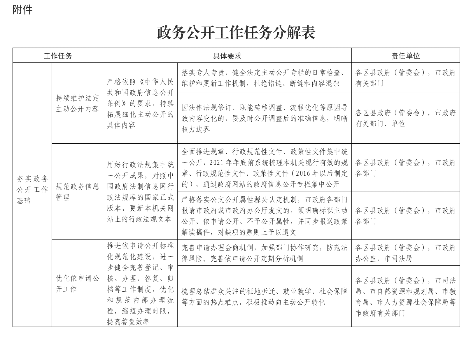 (三)做好优化营商环境领域信息公开。更新完善权责清单和本级政府行政机关机构职能目录并按要求公开,推进政务服务标准化、规范化、便利化。做好精准落实宏观政策、深化减权放权、完善监管机制、创新服务方式等方面的信息公开。做好市场规则标准和监管执法信息公开,市政府相关部门制定并发布市级层面重点监管事项清单以及监管规则和标准。及时公开建设高标准市场体系行动方案的落实举措,加强反垄断与反不正当竞争执法信息发布工作。加大“互联网+执法”、公共法律服务、“双随机、一公开”和行政执法公示制度等信息公开力度。