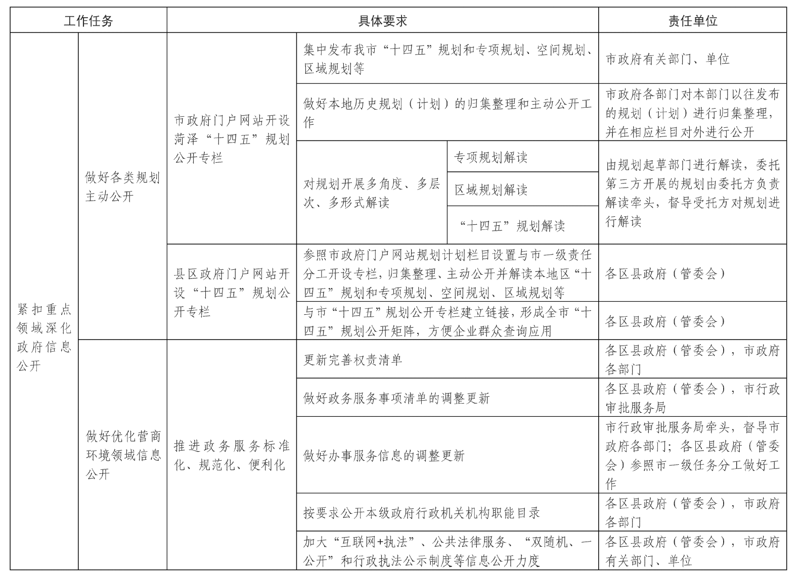 (二)做好各类规划主动公开。市政府门户网站开设菏泽“十四五”规划公开专栏,集中发布我市“十四五”规划和专项规划、空间规划、区域规划等,并对规划开展多角度、多层次、多形式解读,做好本地历史规划(计划)的归集整理和主动公开工作。各县区政府(管委会)门户网站要同步开设“十四五”规划公开专栏,并与市级规划公开专栏建立链接,形成全市“十四五”规划公开矩阵,方便企业群众查询应用。