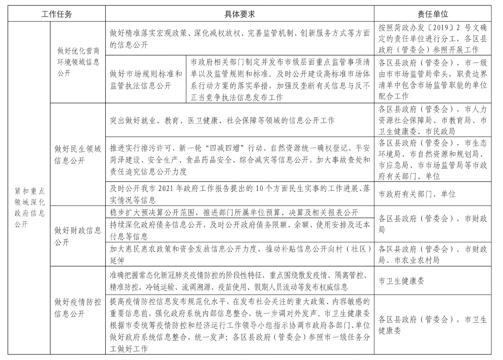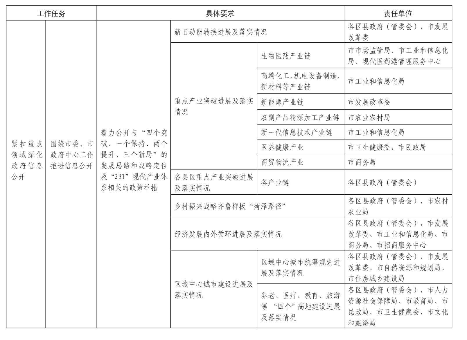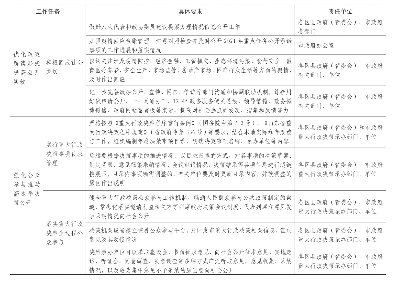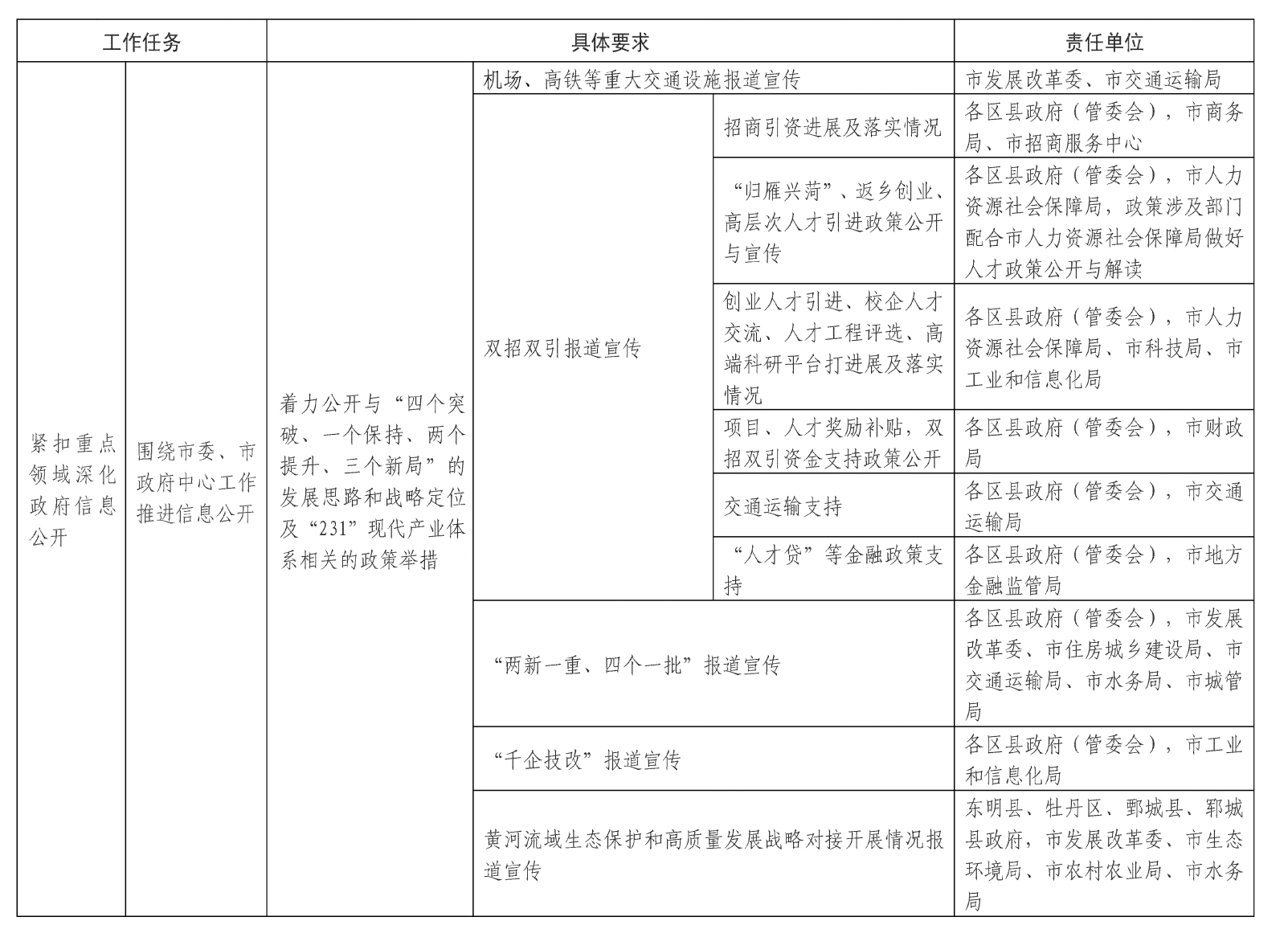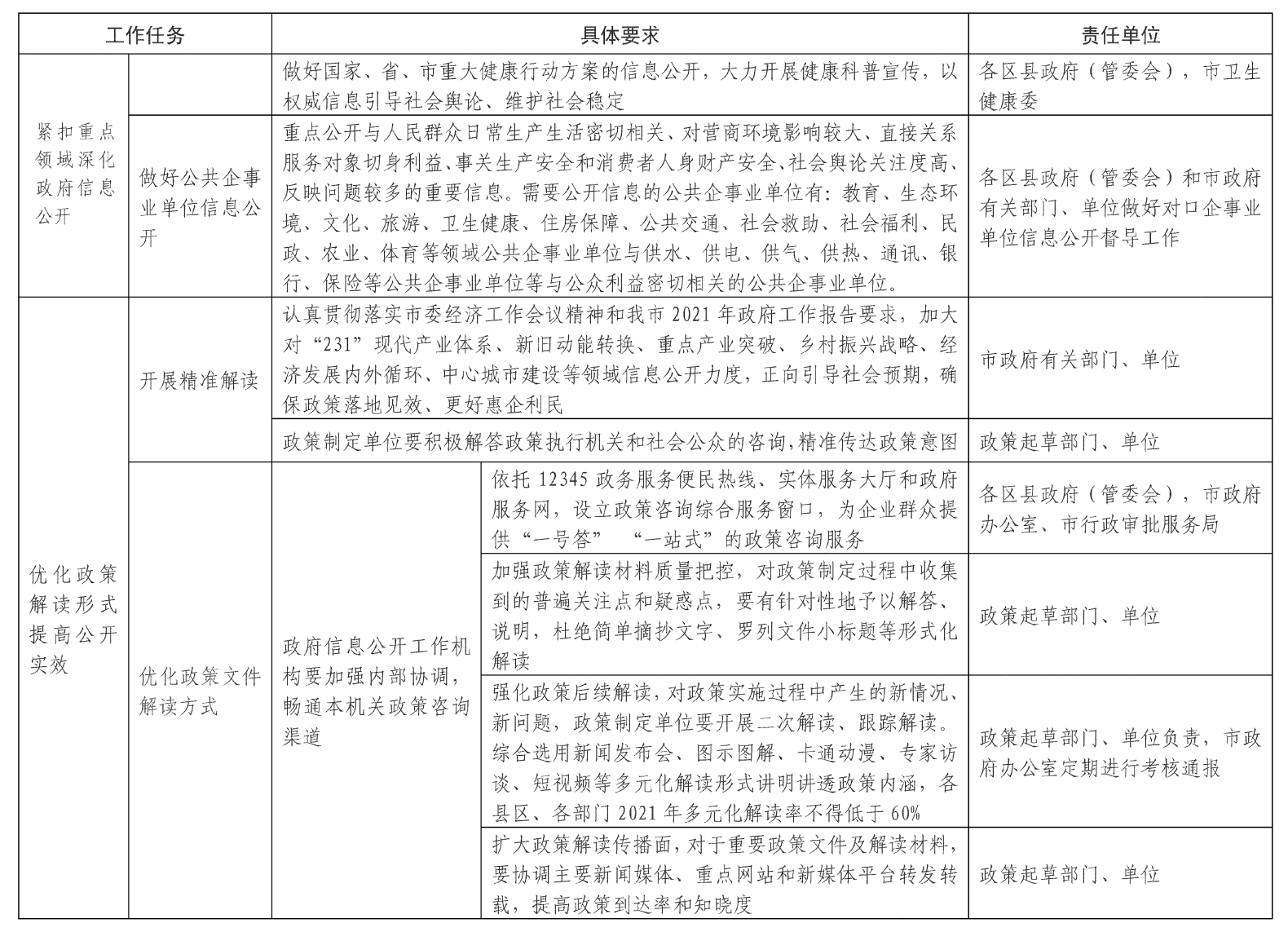 (一)开展精准解读。认真贯彻落实市委经济工作会议精神和我市2021年政府工作报告要求,加大对新旧动能转换、重点产业突破、乡村振兴战略、经济发展内外循环、中心城市建设等领域信息公开力度,正向引导社会预期,确保政策落地见效、更好惠企利民。政策制定单位要积极解答政策执行机关和社会公众的咨询,精准传达政策意图。