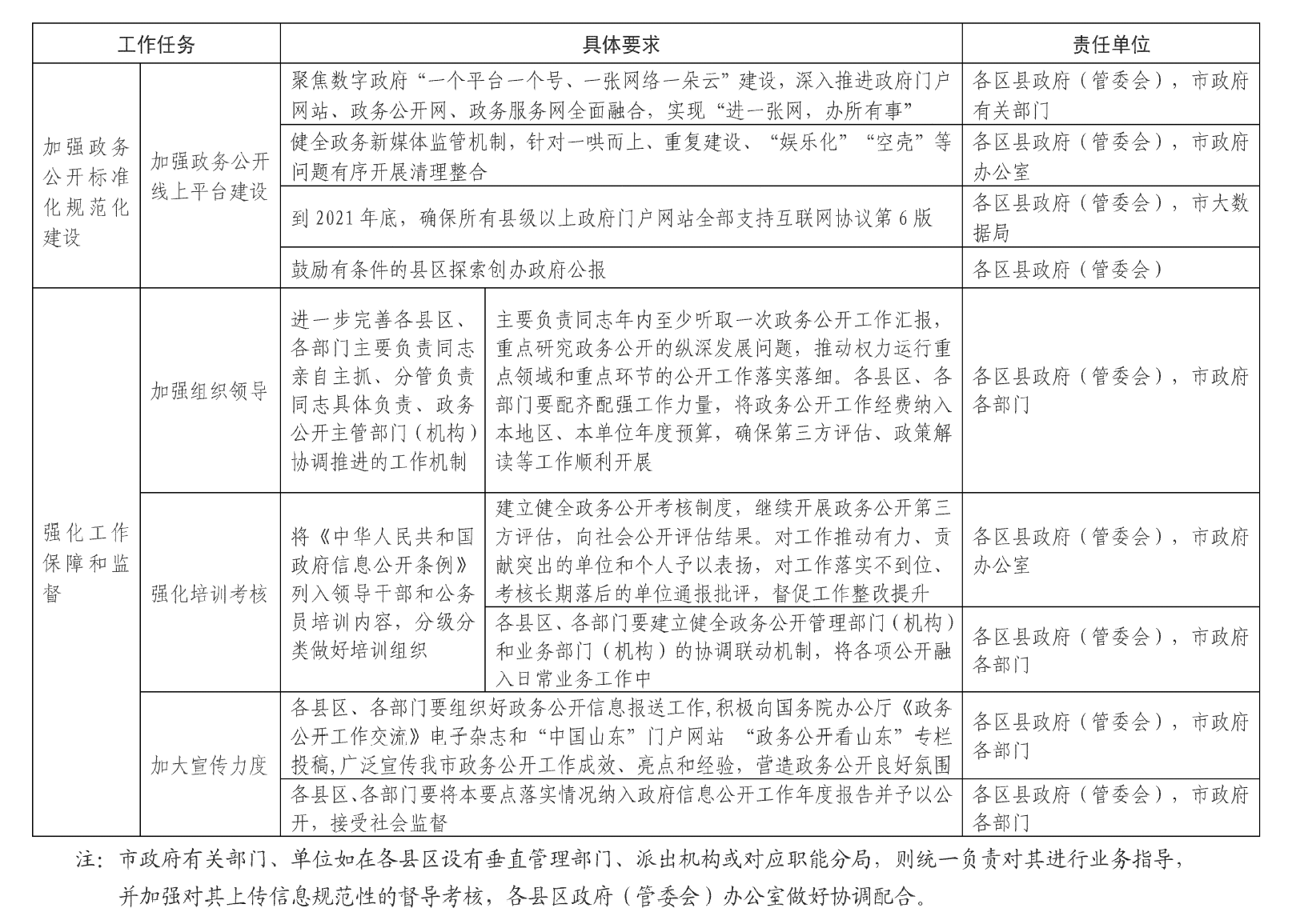 (三)加强政务公开线上平台建设。聚焦数字政府“一个平台一个号、一张网络一朵云”建设,深入推进政府门户网站、政务公开网、政务服务网全面融合,实现“进一张网,办全市事”。健全政务新媒体监管机制,针对一哄而上、重复建设、“娱乐化”“空壳”等问题有序开展清理整合。到2021年底,确保所有县级以上政府门户网站全部支持互联网协议第6版。鼓励有条件的县区探索创办政府公报。