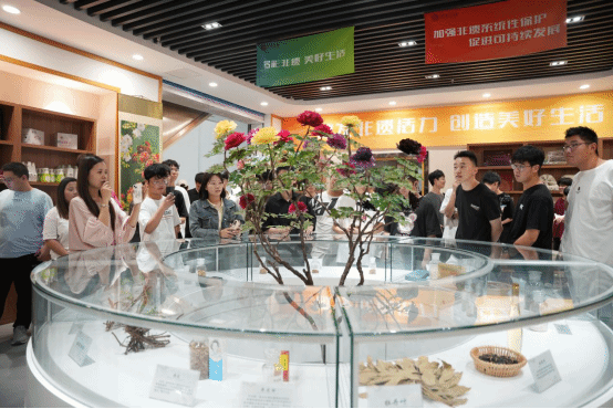 在牡丹产品展销区,柜中展示的牡丹精品吸引了同学们纷纷驻足观看、拍照留念。同学们好奇地向讲解员询问牡丹茶、牡丹化妆品、牡丹食品等牡丹产品的详细信息。据讲解员介绍,国色天香的牡丹不仅有观赏价值,更能衍生出全产业链特色产业,在一代代菏泽牡丹人和无数劳动人民的不懈努力下,目前菏泽已成为了全国最大的牡丹培育、生产、科研、观赏以及出口的基地。大学科技园更是紧抓“互联网+”发展浪潮,与电商企业建立了深度合作,携手打造互联网直播实训基地,为职业学院学子课外研学、校内实习提供坚实有力的平台支撑。