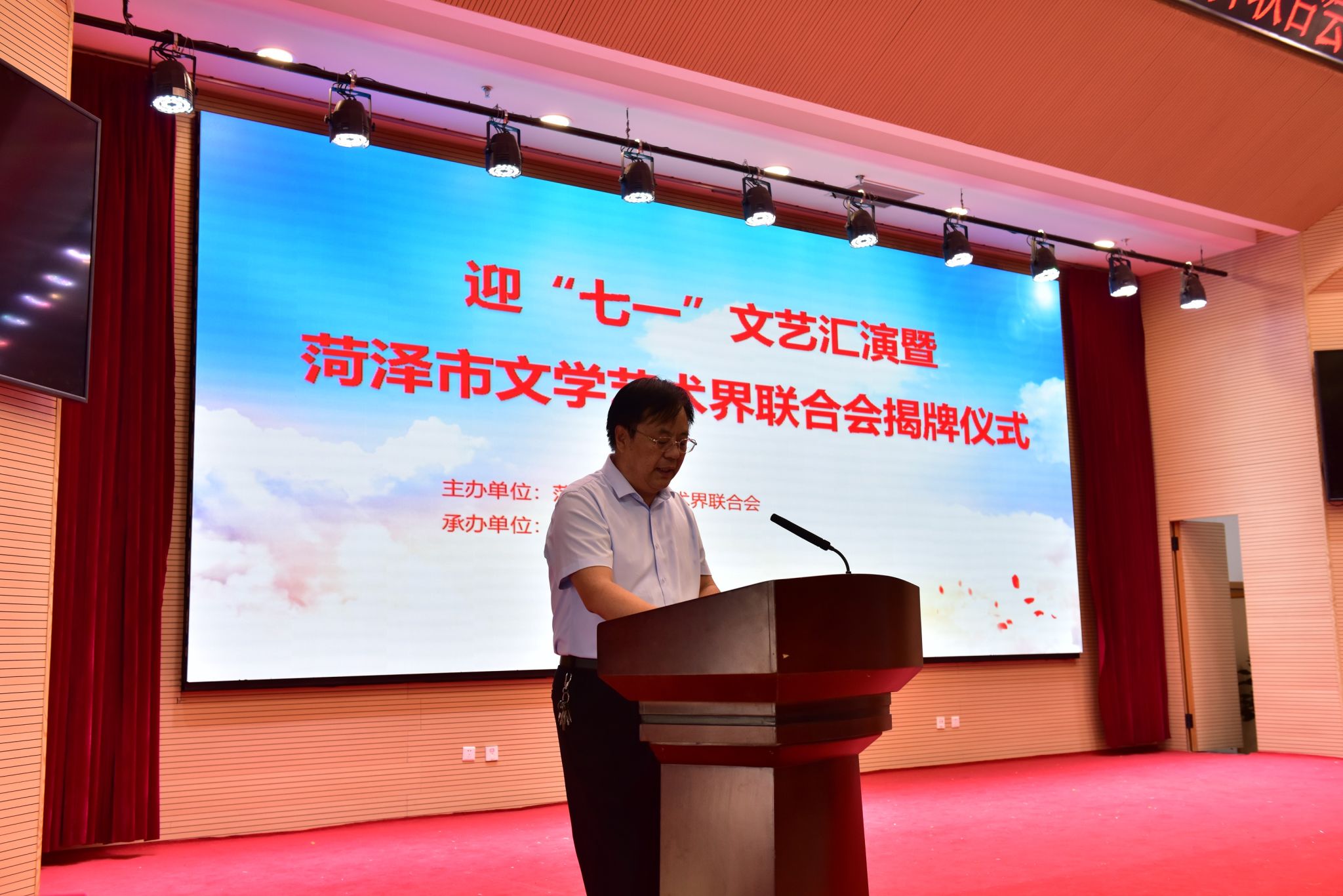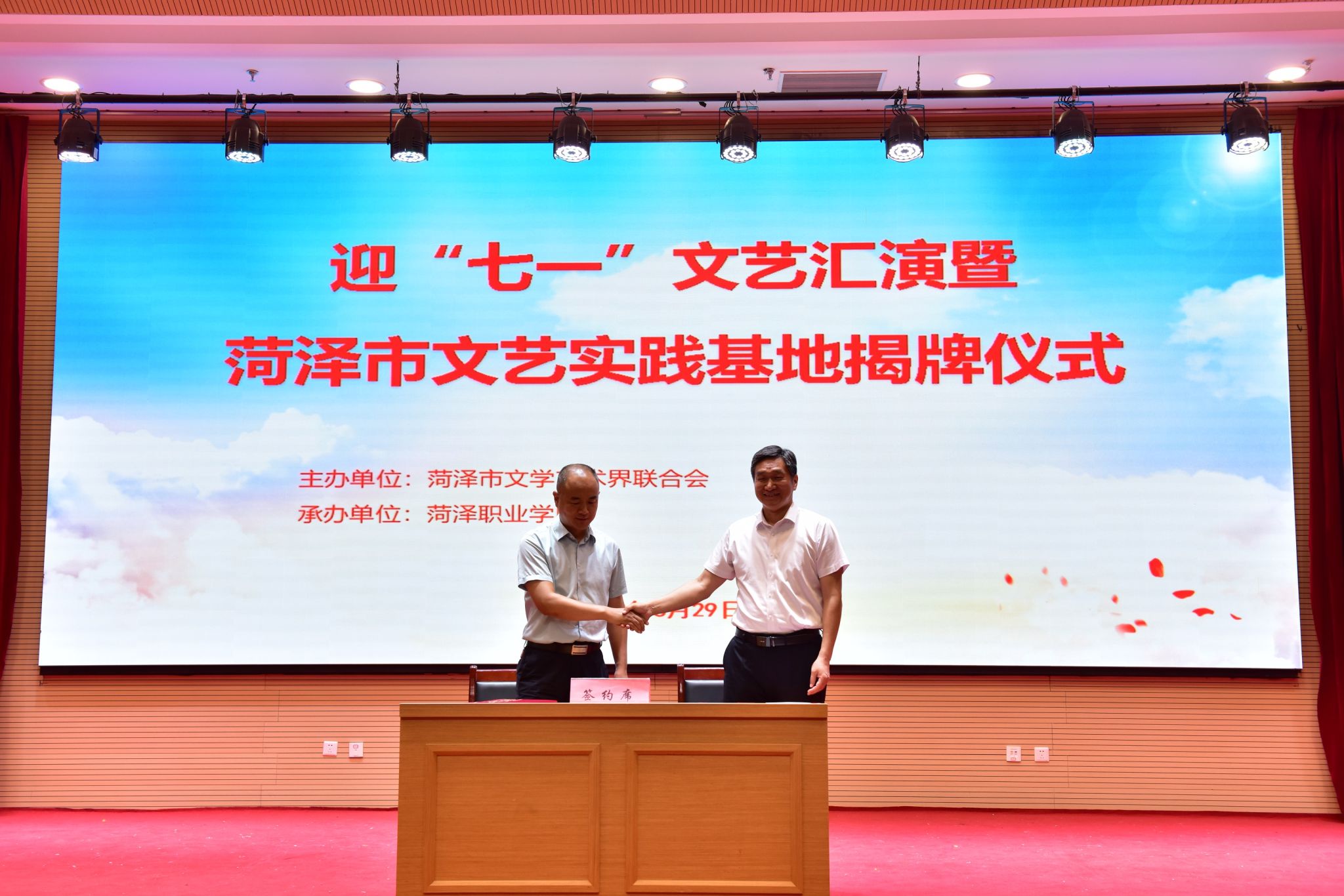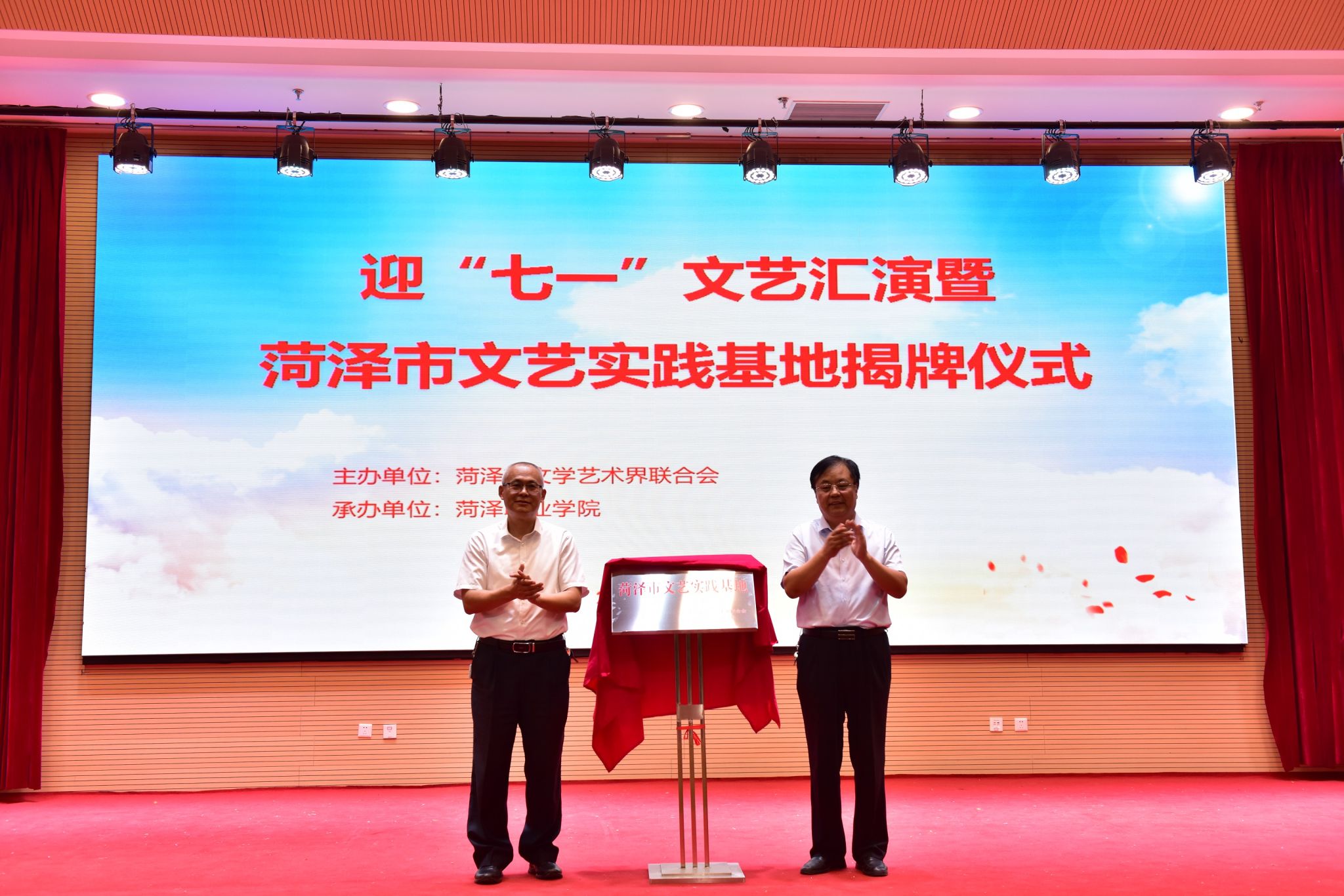 田继雷、袁宗建共同为菏泽市文艺实践基地揭牌,随后进行书画笔会及“七一”文艺汇演。