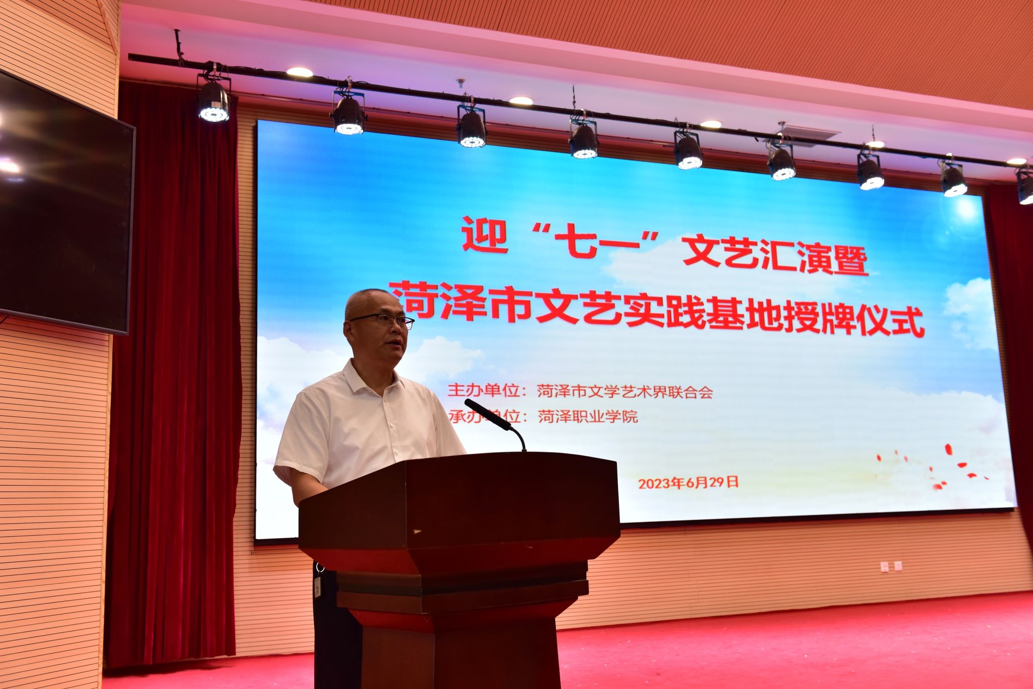 6月29日,由菏泽市文学艺术联合会主办,永利yl23411官网承办的迎“七一”文艺汇演暨菏泽市文艺实践基地揭牌仪式,在永利yl23411官网大学生科技园举行。市文联党组书记、主席田继雷,市文联张运涛副主席,市作家协会主席赵统斌,市书法家协会主席翟永华,市美术家协会副主席丁远远,市音乐家协会副主席蒋虎,市舞蹈家协会副主席张娜,市民间艺术家协会副主席赵东民以及全市文学艺术家代表们,我院党员师生代表出席活动。活动由永利yl23411官网副院长范帆主持。