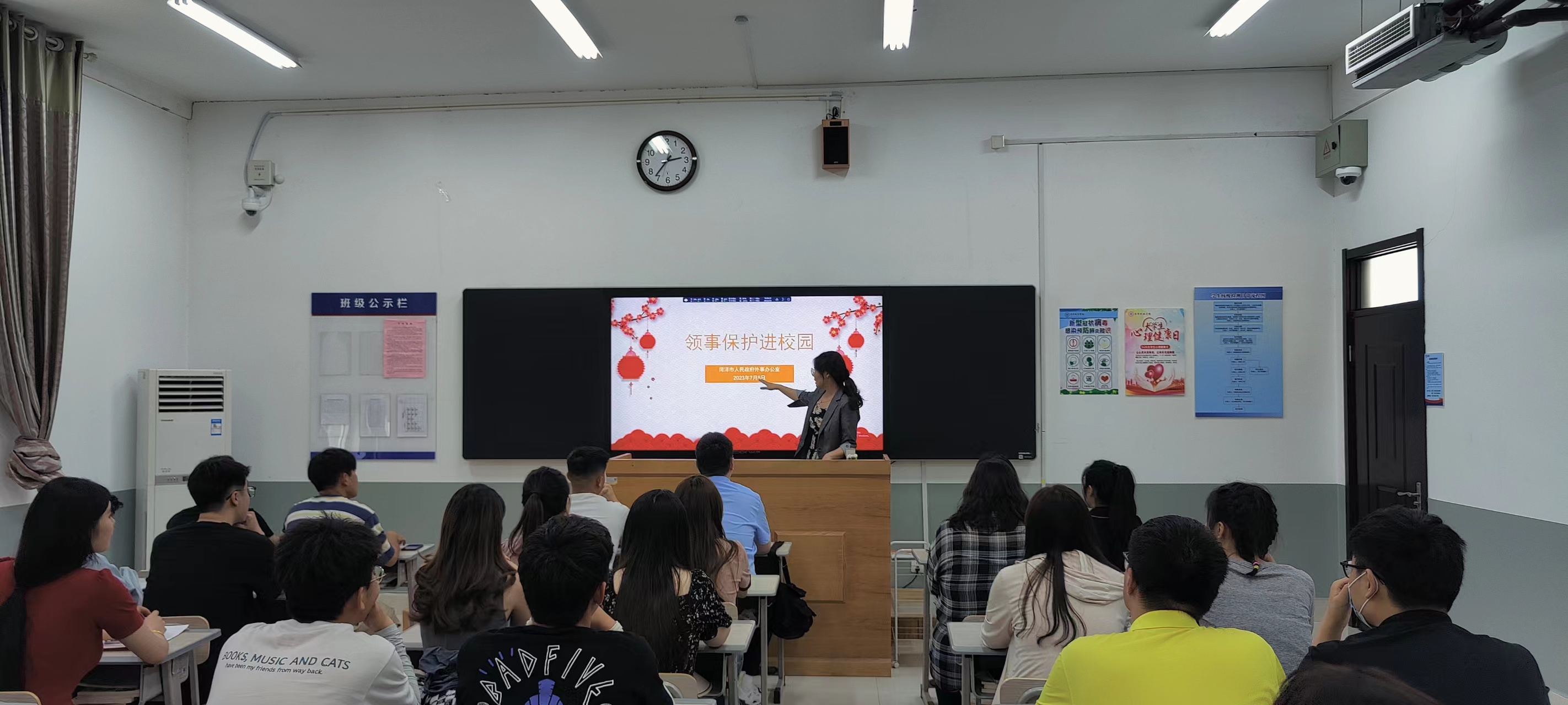 在宣讲时,李欣欣科长详细介绍了海外主要安全风险类型,并从预防性领事保护的角度为在座同学讲解了领事保护的基本知识、出国前的注意事项、领事官员的权限、领事保护工作的基本原则并科普了12308中国外交部全球领事保护热线。出入境管理支队卞艳清为在座同学讲解了护照、往来港澳台通行证及签注、出入境记录等的申办、查询须知。讲座期间,还为在座同学现场播放了领事保护宣传片,发放了相关宣传手册。