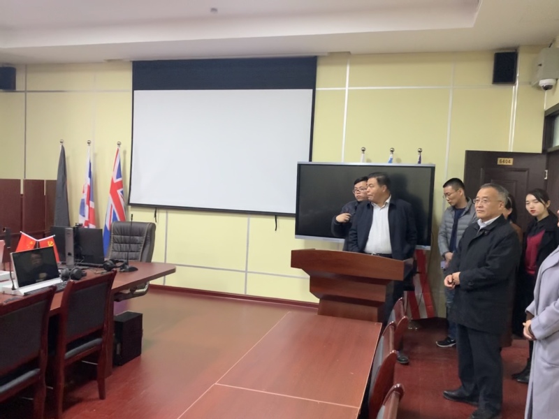 王琳首先向各位领导介绍了国际交流学院的发展进程及重要成果,随后领导们参观了形体房、云课堂、同声传译室等实训教室,朱豫一一进行了详细介绍,领导们对此给予充分肯定。