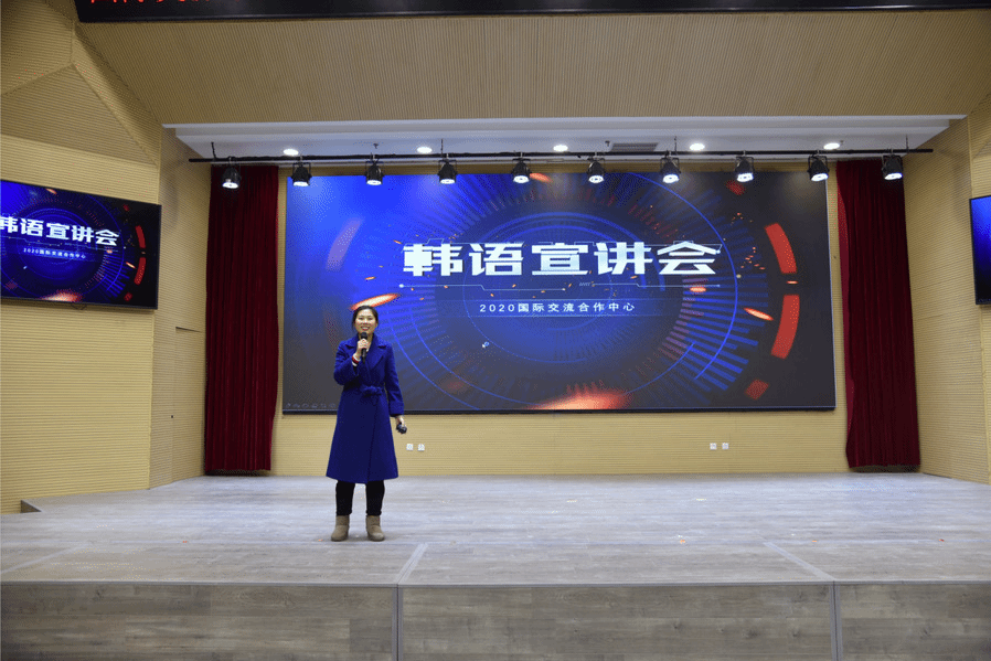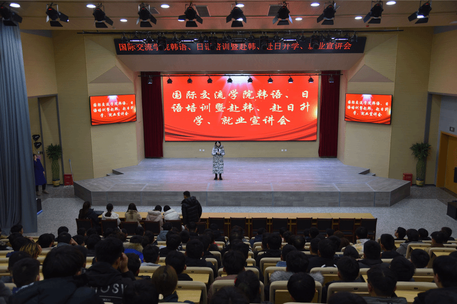 2020年12月1日晚上7点20分,国际交流学院全体教职工在处长朱豫的带领下,在大学科技园三楼报告厅进行国际交流学院韩语、日语培训暨赴韩、赴日升学、就业宣讲会,数百名机电工程系学生热情参与。