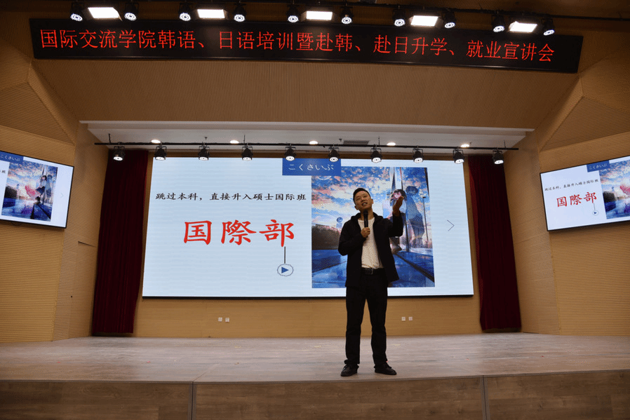 朱豫处长首先介绍了赴日韩学历提升项目及赴日就业前景,并鼓励同学们参加国际交流学院组织的日语韩语培训班,针对国内外的就业形势和薪资水平进行了深入剖析,对外务工人员数量缺口巨大,在日韩就业是一个提升个人能力、精进技术水平的舞台。