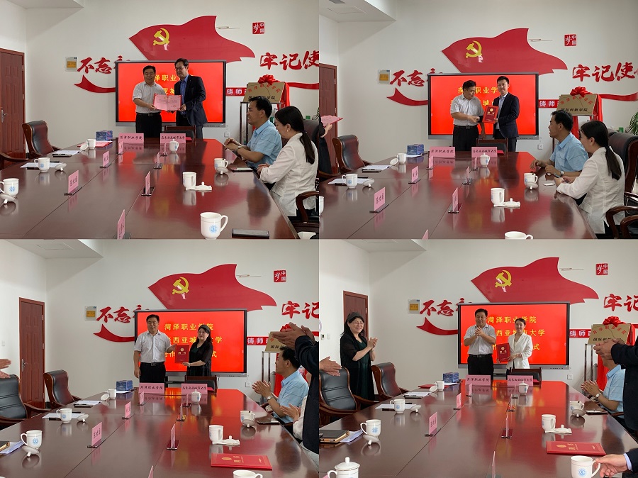 双方就合作意向进行了友好交流后,我院聘请马来西亚城市大学校长倪政立和马来西亚城市大学国际部主任姜忠岐为永利yl23411官网客座教授、聘请朱豫同志为永利yl23411官网国际创新学院院长、马来西亚城市大学山东省项目总监殷茜女士为永利yl23411官网国际创新学院副院长,并颁发了聘书。在双方的见证下,党委委员胡宪奎与马来西亚城市大学校长倪政立签订了合作协议书。