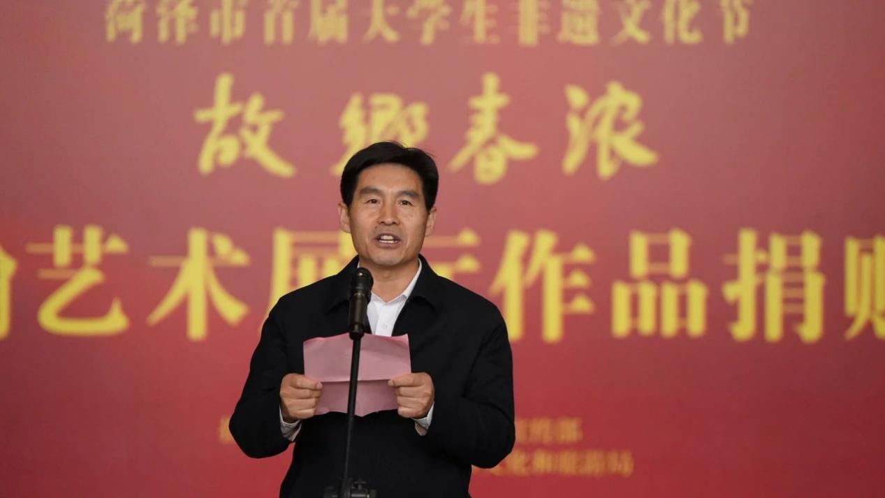 市人大常委会主任王磊在讲话中代表市人大对侯博瀚先生的捐赠善举表示由衷敬意,对本次捐赠活动圆满举行表示祝贺。他表示,菏泽要高质量发展,实现后来居上目标,离不开文化事业的繁荣昌盛,离不开艺术家的鼎力支持,离不开菏泽游子的反哺助力。衷心期待更多的菏泽籍在外艺术家进一步厚植家乡情怀,主动融入家乡发展,为中国牡丹之都文化繁荣、经济腾飞、后来居上作出新的更大贡献。