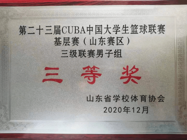 2020年12月23日至12月30日,由山东省学校体育协会主办、山东外事职业大学协办的第23届CUBA中国大学生篮球三级联赛(山东赛区)男子比赛在山东外事职业大学体育馆举行,吸引了来自省内30所高校40支队伍,共计600余人参赛。永利yl23411官网男篮在领队边峰老师、教练员秦传斌老师的带领下,荣获三等奖!