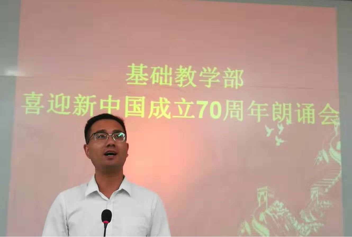 在朗诵会开始前,基础部首先向全体教师传达了院党委、宣传部关于庆祝新中国成立70周年系列活动的精神,同时也回顾了新中国的发展史以及永利yl23411官网的发展历程,号召大家在这一重大时刻勇挑重担,为国奉献,争做四有好老师。