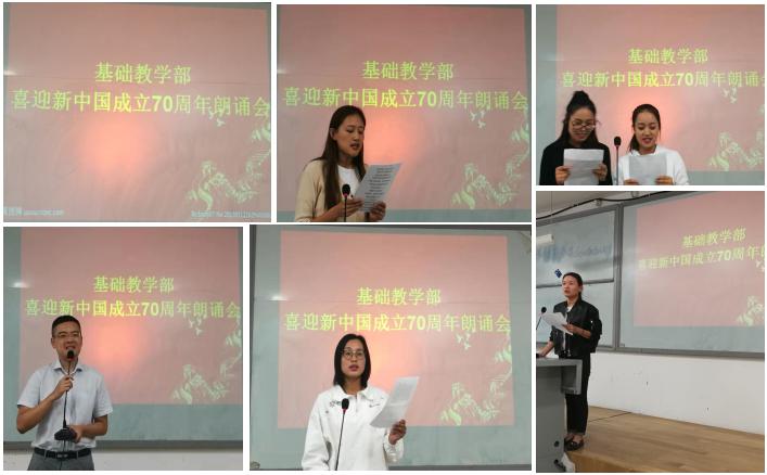 为弘扬基础教学部全体教师爱国情怀,为国庆献礼,在院党委、宣传部的部署下,基础教学部全体教师于2019年9月20日下午在5-3合堂教室举办了“喜迎新中国成立70周年朗诵会”。各教学组积极参与,为祖国母亲献上了满满的热爱之情。