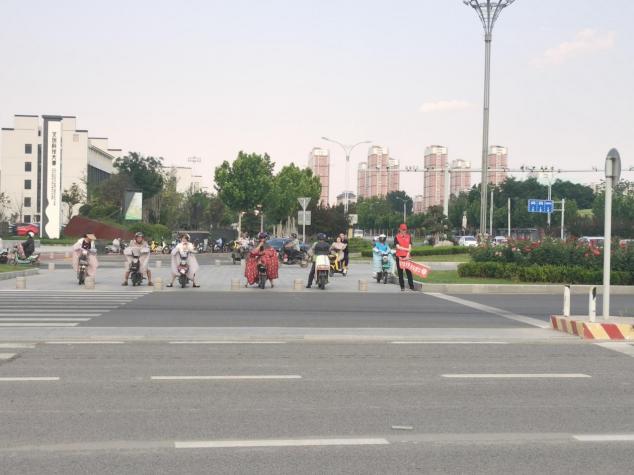 志愿者身穿红马甲,头带红帽,在道路路口,劝导行人及非机动车辆不闯红灯、不乱穿马路,指挥机动车礼让行人,提倡文明出行,营造良好交通秩序。