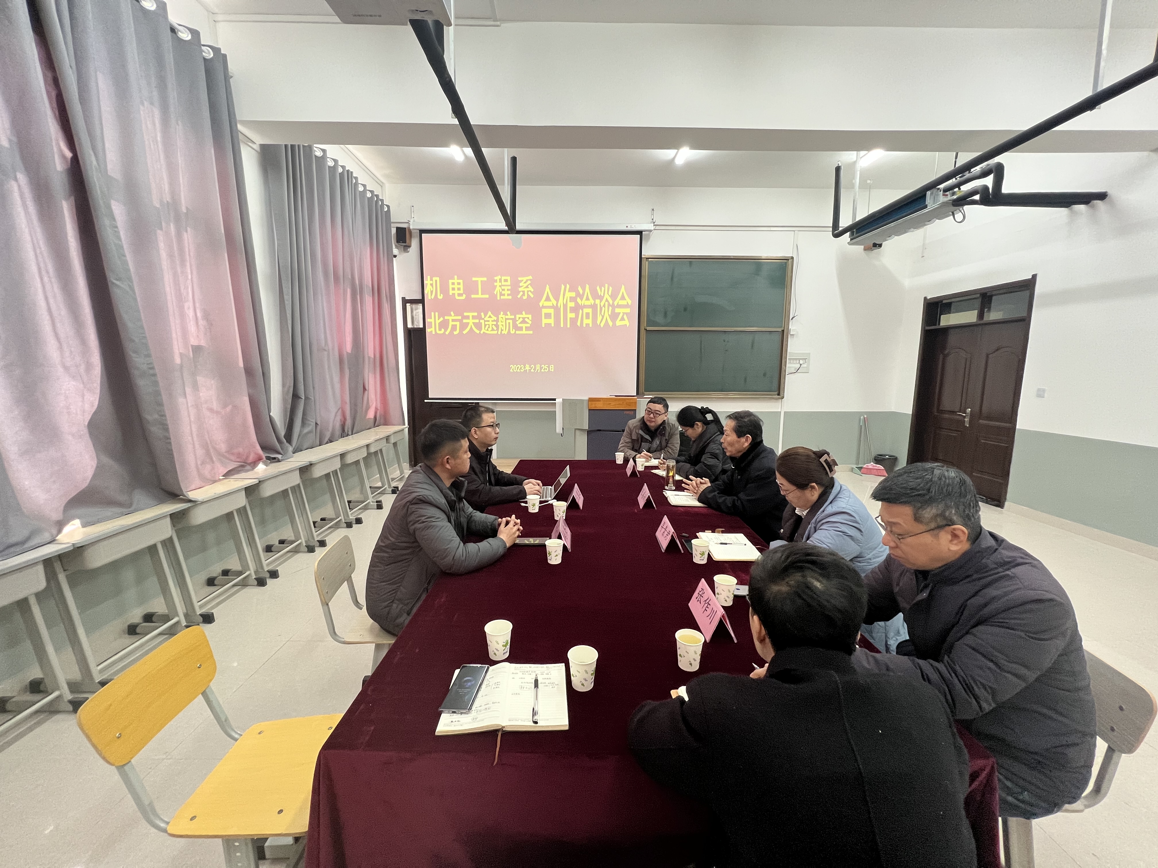 2月25日上午,机电工程系与北方天途航空技术发展(北京)有限公司合作项目洽谈会在机电工程系1205会议室举行。机电工程系主任张善雨、副书记寻素君、副主任周佩、副主任张作川等有关人员与北方天途航空技术发展(北京)有限公司职教项目总监王慧志、马圣群就校企合作无人机项目等工作进行了认真洽谈。