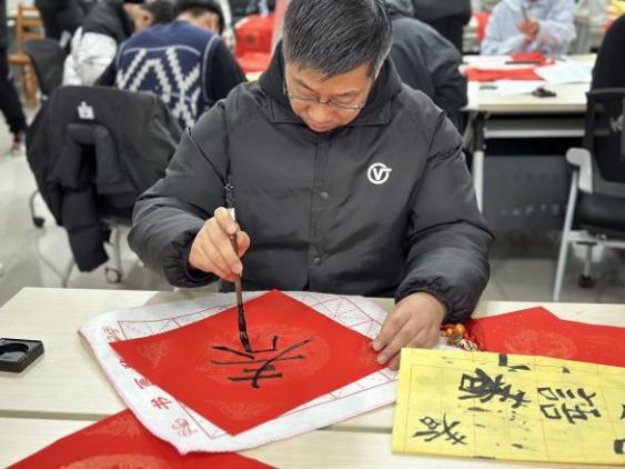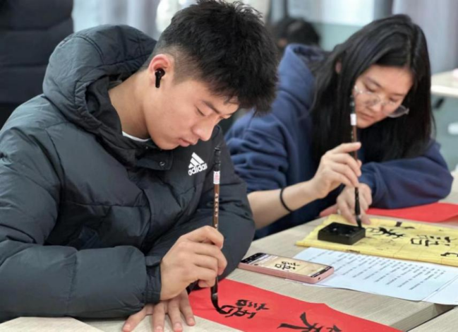 随着毛笔的一起一落,一幅幅笔力遒劲、风格迥异的吉祥作品跃然纸上,参与活动的师生们有序排队等“福”,互相讨论着各幅春联的美好寓意,现场洋溢着浓浓的温馨氛围。