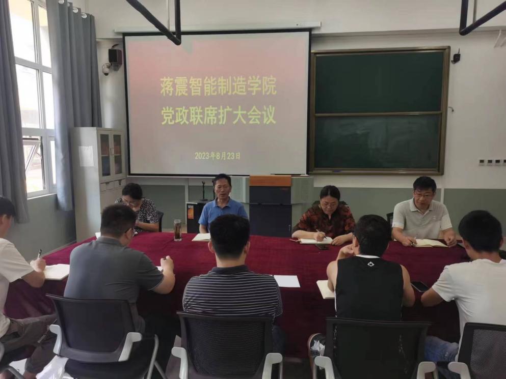 8月23日,蒋震智能制造学院召开新学期第一次党政联席扩大会议,蒋震智能制造学院全体班子成员和行政人员、辅导员参加了会议。会上,蒋震智能制造学院党总支书记张善雨就做好秋季开学各项准备工作进行了安排。主要包括:(一)新生、老生返校工作安排;(二)教学楼各教室卫生、教学设施、空调、门窗及安全隐患等进行排查;(三)课程安排;(四)辅导员、班主任调整;(五)开学后进行为期两个月的安全教育、纪律教育。要求大家认清形势、振奋精神、凝聚力量、团结拼搏,努力开创工作新局面。