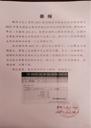 建筑与化工学院2021级动物医学铁航班赵亚甜同学在2023年度全国执业兽医资格全科考试中获得佳绩,顺利通过考试(及格线224分),取得全国执业兽医资格证。全国执业兽医师资格证书是兽医行业准入证,是中华人民共和国农业农村部颁发的唯一行业资格证书。