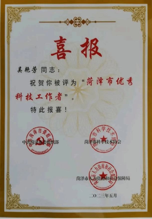 近期接到有关部门通知,我院教师吴艳芳获得了“菏泽市优秀科技工作者”荣誉称号。该荣誉称号是由中共菏泽市委组织部、菏泽市科学技术协会、菏泽市人力资源和社会保障局等单位,为了弘扬“尊重知识、尊重人才”时代风尚,激励广大科技工作者积极投身人才强市和“科教兴菏”战略,在全市范围内经过严格选树联合授予的。