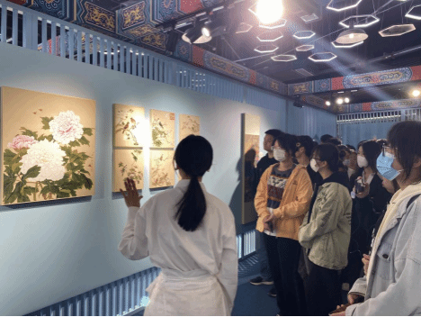 之后,跟随老师的引领,进入了“小故宫”内,整个设计主题内容是根据故宫博物馆内部与牡丹有关的字画以及部分场景设计的,中间是一廊廊的展示区域,周围一圈是具有浓厚中式设计的休息区域,可谓是在市区中“闹中取静”的极佳地方。听着老师的讲解,同学们纷纷表示有种穿越的感觉。