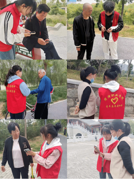 志愿者分为两队,两人一组在环堤公园东西两侧分别进行一对一志愿服务,志愿者们首先去到河堤大坝的亭子,向休息的老人询问对于智能手机的使用有什么不懂的和需要解决的地方,针对老年人在 出行、就医、消费等方面不会使用智能手机问题,志愿者采取一对一 、手把手的方式辅导讲解,切实帮助老年人解决“数字鸿沟” 问题,帮助老年人掌握智能手机基本使用技巧。