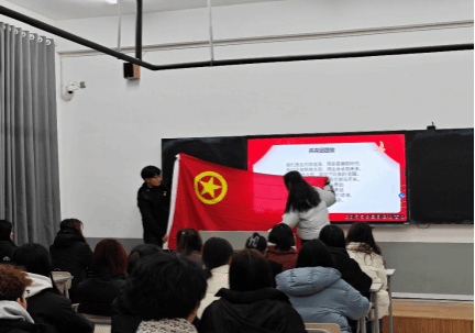 团总支副书记高捷同学带领新团员学习共青团的基础知识,包括团旗、团徽的含义;团员证的含义等。