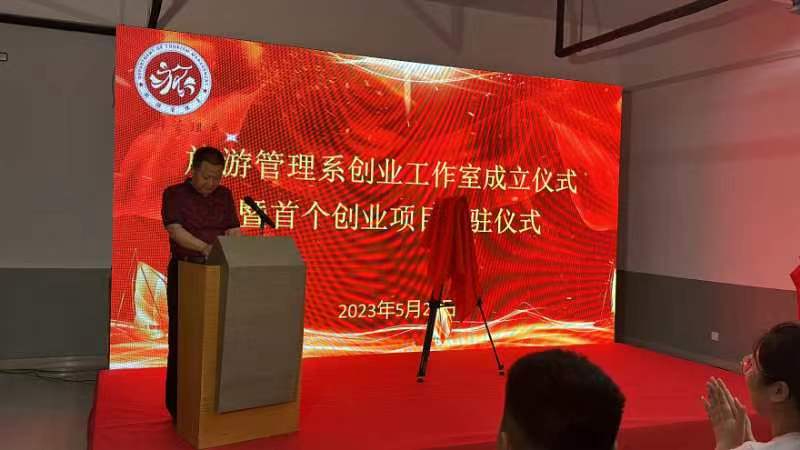 为深入贯彻党的二十大精神,进一步加强创业服务,激发大学生创业热情,5月26日下午,旅游管理系在4101教室举行创业工作室成立仪式暨首个创业项目进驻仪式。旅游管理系党总支副书记李海东、学工办主任尹娇娇、学工办副主任朱铎,创业项目负责人刘振,旅游管理系部分教师出席此次活动。