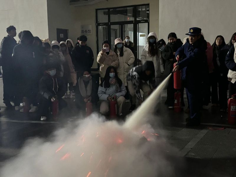 何鑫老师向师生介绍了各种消防设备和器材,如灭火器、喷水器、防烟面罩等,详细讲解了各种设备的适用场景和使用方法,并指导师生正确使用灭火器,让大家牢记四字口诀:提、拔、握、压。